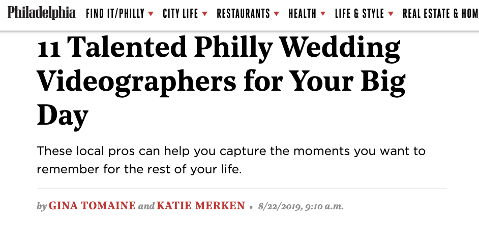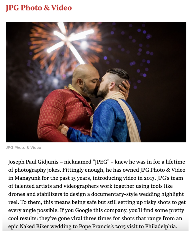 - Philadelphia Inquirer’s Reader’s Choice for “Best Wedding Photography” and “Best Wedding Videographer”